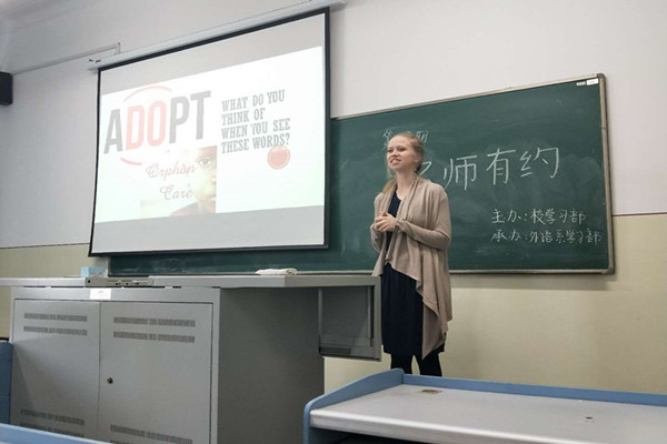 此次讲座的主题为“Care for orphans”,即对孤儿群体的关怀。Rachel以幻灯片做为辅助,向在场同学分享其家庭曾经收养孤儿的经历以及其本人参与关爱孤儿志愿活动的体验与收获。并鼓励大家关注这一弱势群体,号召同学们多多参与帮助孤儿的社会活动。