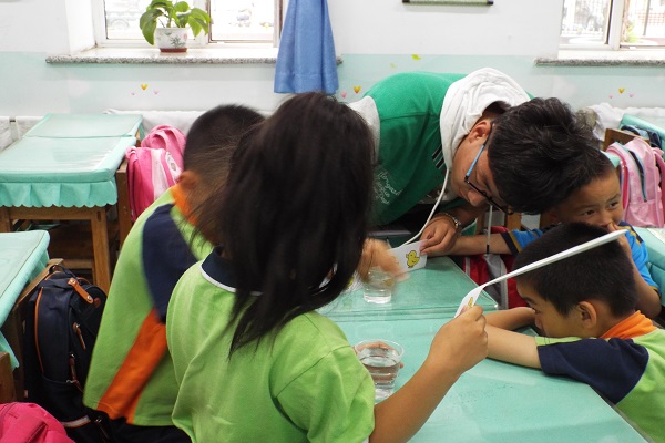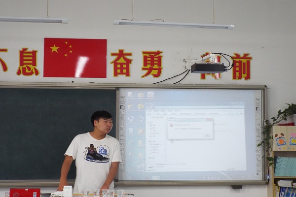 本次课堂的主题是有趣的物理现象,张津铭由生活中随处可见的简单物理现象,将同学们引入主题。在课堂上他用提问的方式与学生互动,活跃课堂气氛,极大地调动大家学习的积极性。志愿者们拿出实验道具,让同学们亲自感受实验,大家积极参与,在志愿者的帮助下完成许多有趣的物理实验。