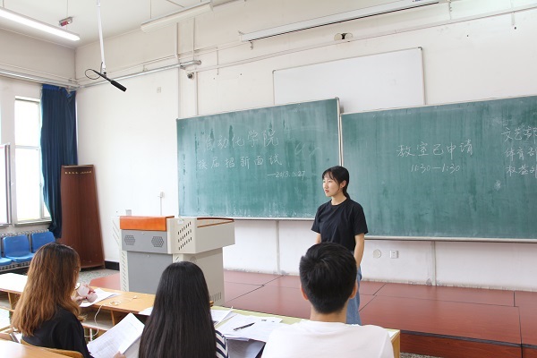 6月27日上午11时50分,自动化学院于21B教学楼举行学生组织副部招新面试。自动化学院团委常务副书记王浩人,学生会主席刘天承组织本次活动,各部门部长参加活动并担任评委,2017级本科生参加竞选。