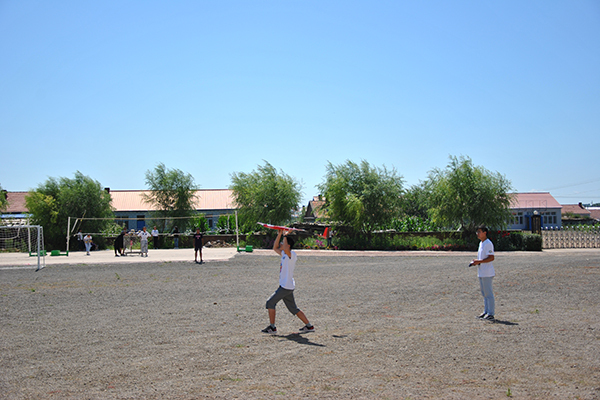 第四节课开始,小朋友们来到学校操场进行集合,蒋春晓为同学们试飞了上午讲课时用到的电动滑翔机以及航模队带来的航拍机,中心学校校长王成武来到操场观看航模试飞表演。航模试飞表演后,哈尔滨工程大学彩虹服务队全体队员来到教学楼前与中心学校的老师、学生合影留念。合影后孩子们来到操场,共同放飞了各自叠的纸飞机,哈尔滨工程大学彩虹服务队指导老师王辉分别为纸飞机飞行距离最远、飞行时间最长的小朋友颁发了小礼品。