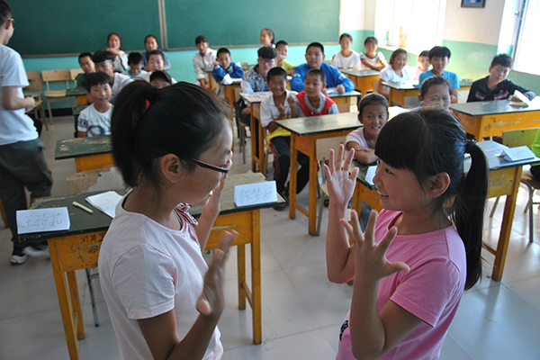 第二节课中,彩虹服务队队员与小朋友们进行了一场生动活泼的你画我猜、你演我猜小游戏。在队员们介绍完游戏规则后,小朋友们纷纷举手报名,在游戏中小朋友们开动脑筋,同样的题目中经常出现不同的表演方法,观看的同学们也露出了开心的笑容。