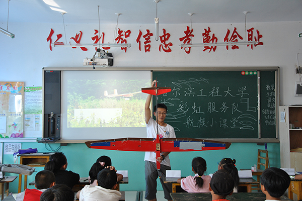 8月18日上午,哈尔滨工程大学彩虹服务队为七棵树镇中心学校的小朋友们带来航模知识小课堂。上午八点,队员们来到教室,便看到了早早来到的孩子们。在孩子们的眼神中,队员们看到了他们对于航模知识殷切的渴望。
