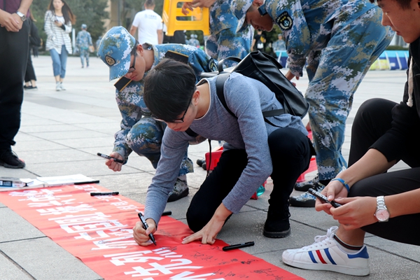 活动期间现场拉起写有“铭记历史,缅怀先烈,勿忘国耻,振兴中华”的横幅,同学们伫立围观并在烈士纪念活动横幅上签名铭志。