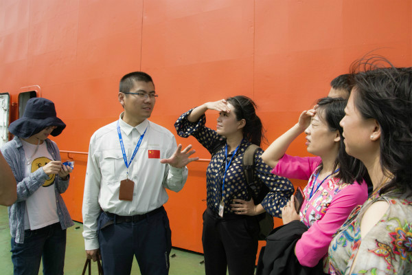 哈尔滨工程大学北极科学考察第一人的韩笑老师向党支部成员分享自己的心得体会。在二副邢豪的带领下,成员们登上雪龙号进行参观。成员们参观船长控制室,通讯室,船员休息室等,期间采访雪龙号船长朱建刚先生,他叮嘱成员要努力学习专业知识,积极响应习总书记海洋强国的号召,做有思想、敢担当、有作为的新时代青年。成员们来到雪龙号一层餐厅,体验船员的日常饮食,感受科考队员的生活。成员们来到科研工作室,科考人员为大家讲解科考的目的及意义,为大家科普海洋生物、海上浮冰、水下装备方面的知识。
