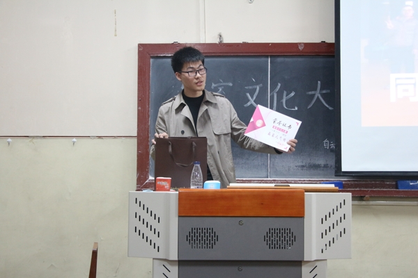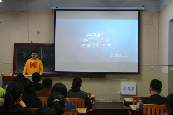 赵煜博向新生展示第一届寝室文化大赛获奖寝室的记录视频,并对各种类型寝室进行概括。第一届寝室文化大赛的获奖寝室539的寝室长路九千进行发言,他对新生讲述寝室文化大赛的起源,诠释寝室文化的内涵,并就寝室文化大赛提出自己的体会和建议。宣讲会尾声,赵煜博对寝室文化大赛进行总结。