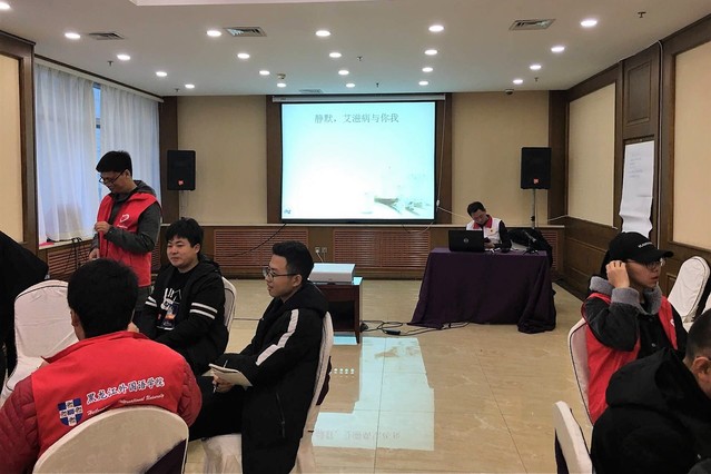 到达会场后,全体成员按要求穿上志愿者红色马甲并整齐入座。随后,主讲人就艾滋病进行讲解并与在座学员进行互动交流,内容主要包括艾滋病的病理、传播途径、症状、预防措施。活动过程中,部分同学向主讲人提出疑问,主讲人一一详细解答。最后,由活动负责人为全体成员播放关爱艾滋病患者的宣传短片,并呼吁大家积极宣传预防艾滋病的方式方法。