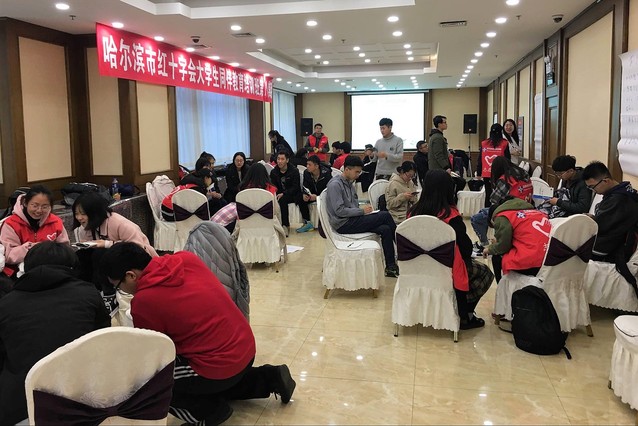 11月4日,动力学院大一部分同学在动力小火柴志愿服务队成员刘建国的带领下抵达帕弗尔大厦参与2018哈尔滨红十字会第八期同伴教育宣讲会。