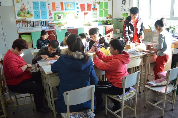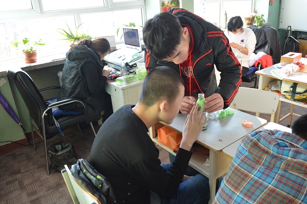 志愿者们亲切地与孩子们打招呼,开展彩泥贴瓶创意活动。活动中志愿者耐心地教孩子们将彩泥贴于玻璃瓶上,用各自的想象将彩泥捏出不同形状。孩子们自由遐想,并积极投入实践,创作出精美作品,拿着彩瓶向老师和同学们展示。