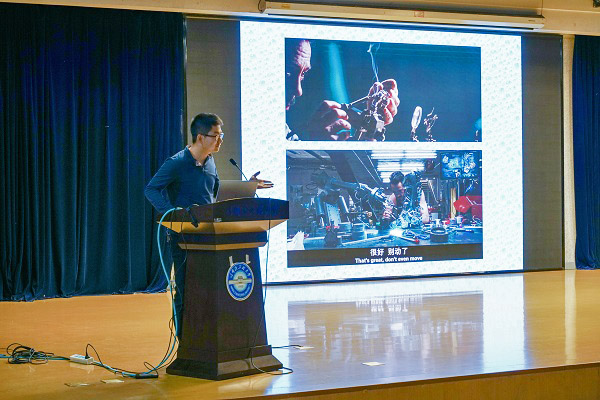 韩笑讲述参加此次北极科考,圆满完成声学方面的研究,填补我国极地声学部分研究空白的经历。他从北冰洋地理、雪龙船介绍及行前准备、声学试验开展情况介绍、声学设备助力北极科考、第九次北极科考精彩瞬间五个方面向同学们详细讲述参与北极科考的经历,通过图片、视频、新闻纪录等方式直观地让学生们了解这段经历,激发学生们的及学习兴趣。