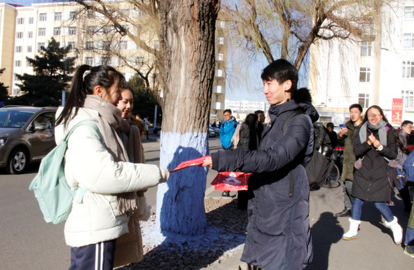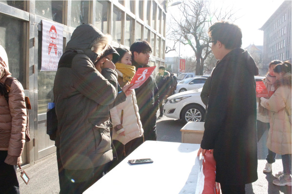 11月29日,动力与能源工程学院团委于大学生美食广场前开展“正视艾滋,向‘零’艾滋迈进”宣传活动。本次活动由团委副书记鞠美娜及组织部部长郭宗伟负责,组织部部员参加本次活动。