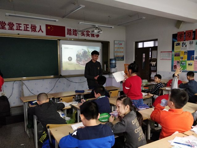到达学校后,陈嘉庆将任务快速分配后便进入授课环节。由欧阳涛担任主讲,向小朋友们介绍垃圾的分类、节能与再生资源、废物利用三大部分内容,通过播放环保视频、让小朋友们体验垃圾飞行棋、动手实践创意物品三个环节提高小朋友的参与度。在最后的动手实践环节中,小朋友们认真思考,写出自己对环保的认识,并为大家朗读自己的环保宣言。