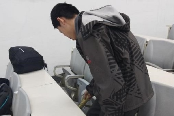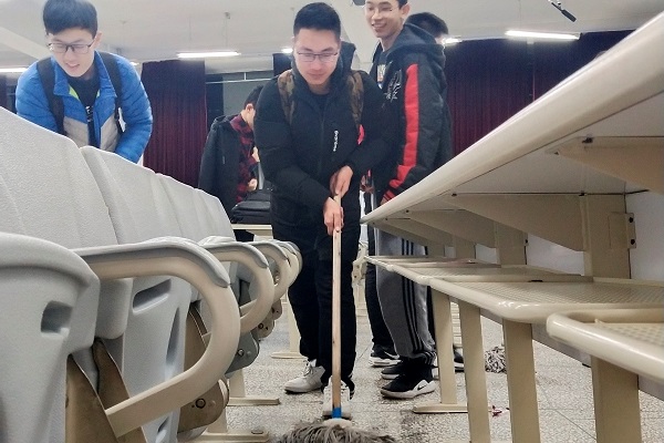 团支部成员分为两组,一组对教室的地面进行清理,利用工具清除地面上的污迹。另一组对教室过道进行深度清理。在打扫教室的过程中,团支部成员们分工明确,通力协作,经过数小时的清理工作将主楼教室清理干净,获得主楼管理人员的肯定。