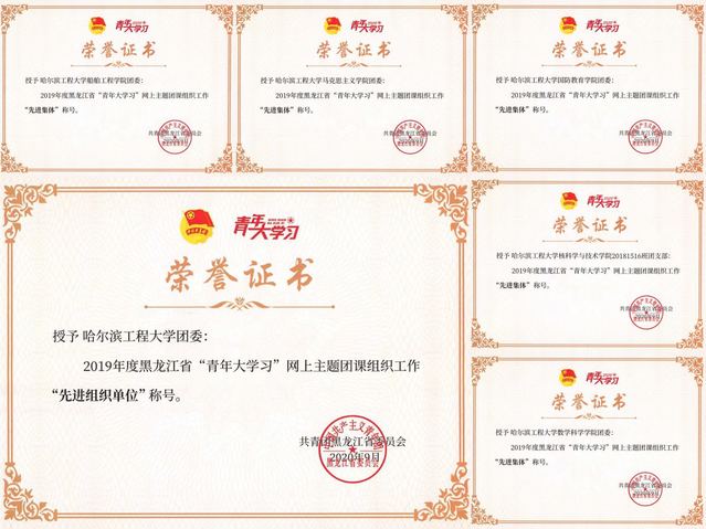 哈尔滨工程大学团委荣获2019年度黑龙江省“青年大学习”主题团课组织工作“先进组织单位”称号。船舶工程学院团委、核科学与技术学院20181516班团支部、国防教育学院团委、马克思主义学院团委、数学科学学院团委荣获2019年度黑龙江省“青年大学习”主题团课组织工作“先进集体”称号。王琦、王炳哲、白婷、毕聪智、刘东平、关向阳、纪宇琦、李瑶、李大任、李文宝壮、杨瑜婧、宋卫国、张丽剑、赵永峰、高明等十五名师生荣获2019年度黑龙江省“青年大学习”主题团课组织工作“先进个人”称号。
