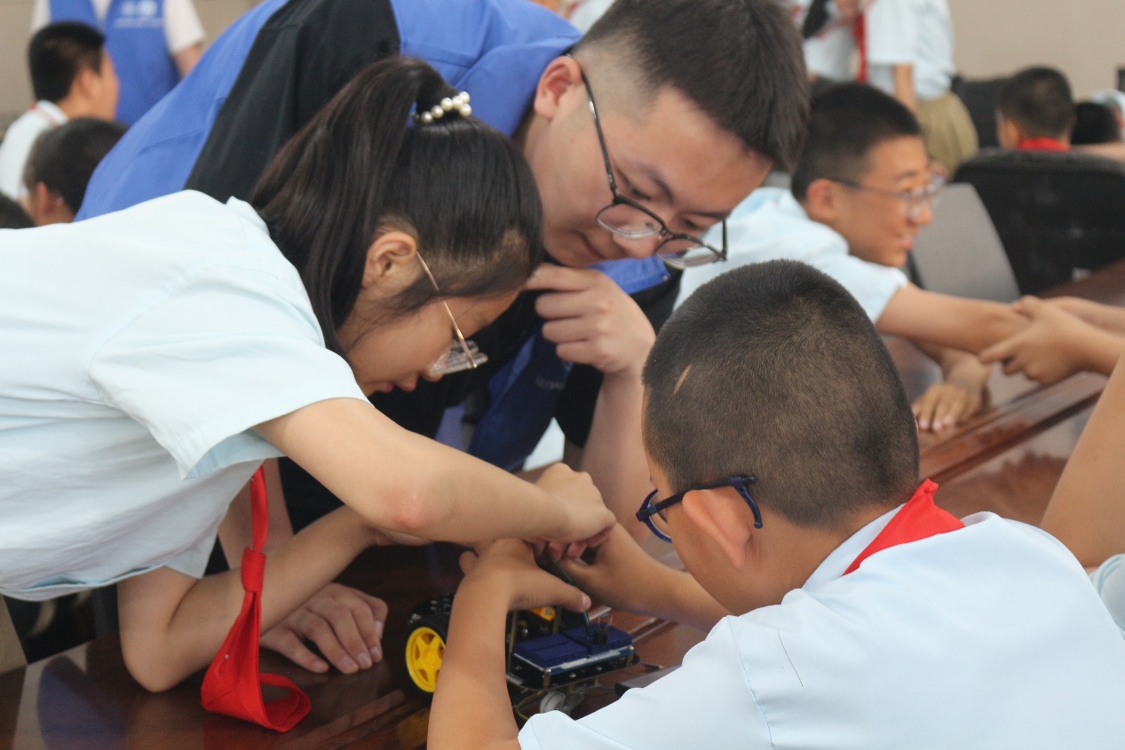 图8志愿者指导学生们拼接小车